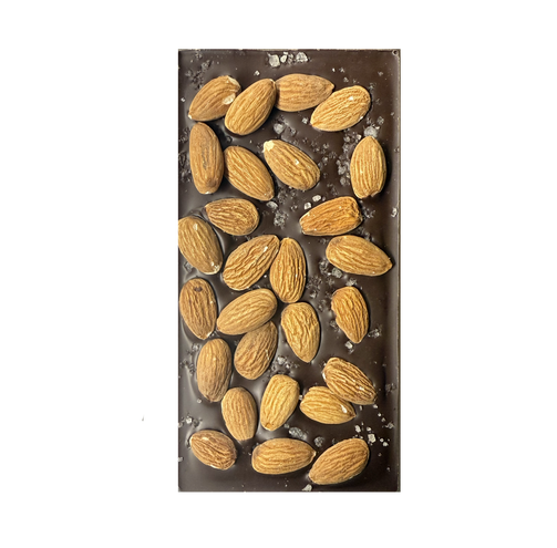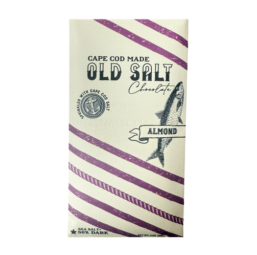 56% Dark Belgian chocolate hand sprinkled with Cape Cod sea salt and whole almonds. Available for Shipping April 1
