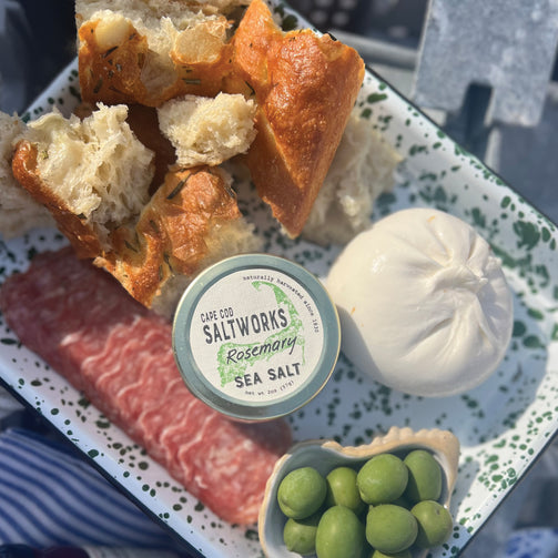 This rosemary sea salt blend is made with Cape Cod solar evaporated sea salt by Cape Cod Salt Works. Solar evaporated sea salt is a long standing tradition on Cape Cod dating back to the early 1800s. Rosemary adds a herbaceous flavor that pairs perfectly with the salt creating a savory topping to any dish.